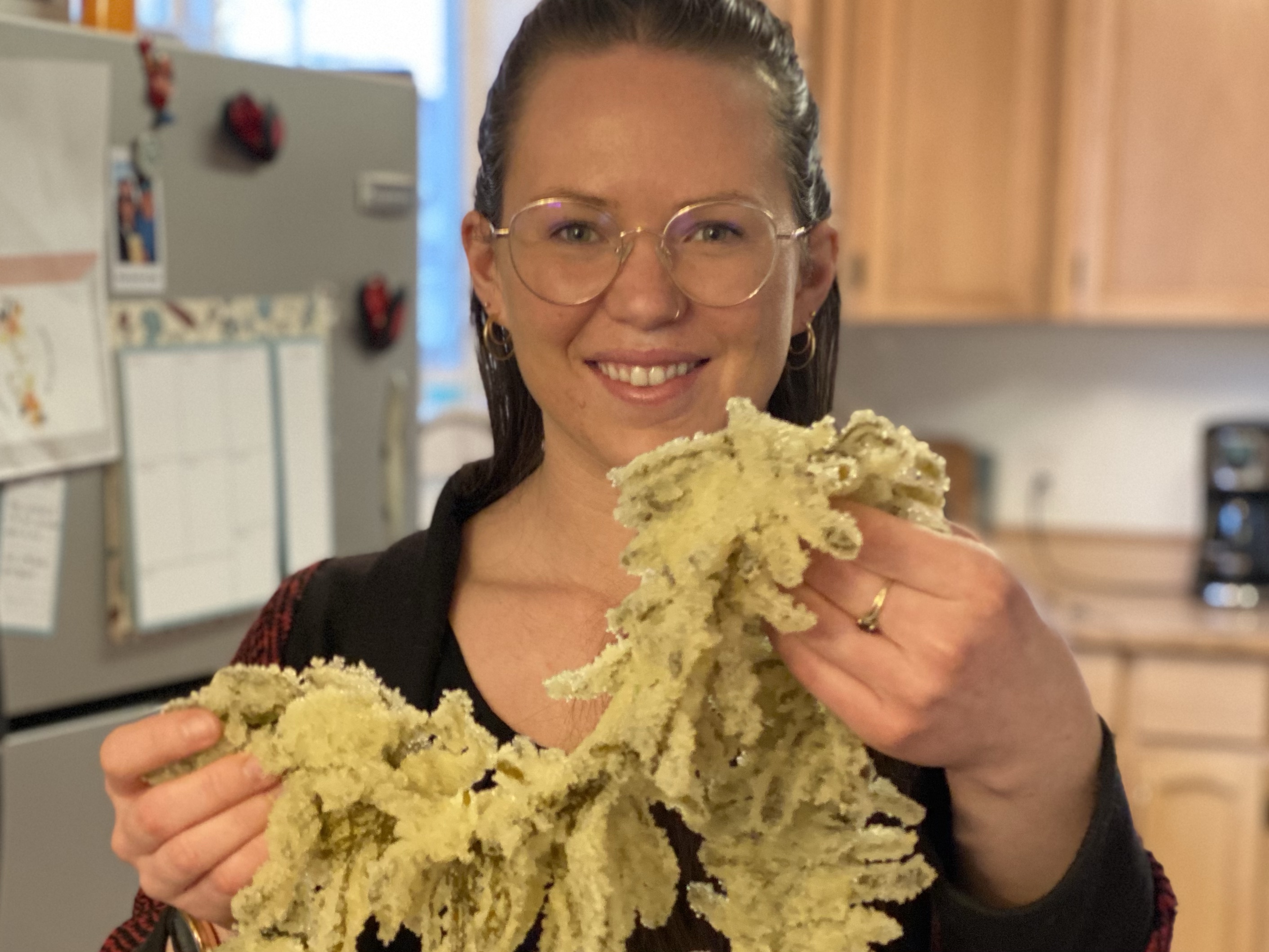 Sometimes we’ll receive s’waanx fresh from the ocean, and sometimes it comes brined. Brining helps preserve the eggs, making them last longer. If you’re thawing s’waanx from the freezer, most likely it’s been brined. If they have a slightly yellow colour, they’re likely brined. All you have to do is rinse the s’waanx thoroughly and let it soak in cold water for up to 24 hours. (I’ve cooked brined s’waanx before and forgot to soak it, and omg was it salty!). Steve’s grandma Millie would soak it for 24 hours with water running over it to remove the brine (they did this in a cool basement).